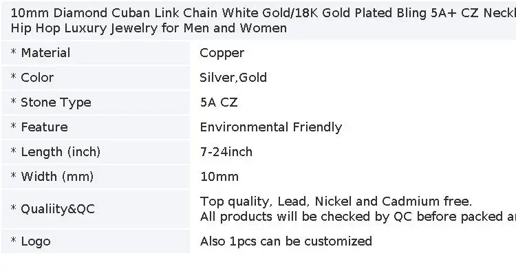 10mm Diamond Cuban Link Chain White Gold/18K Gold Plated Bling 5A+ CZ Necklace Rapper Hip Hop Luxury Jewelry for Men and Women