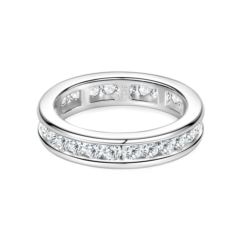 Real S925 Silver Groove Inlaid with D VVS1 Round Moissanite Ring for Women Fashion Wedding Ring with GRA Eternity Band